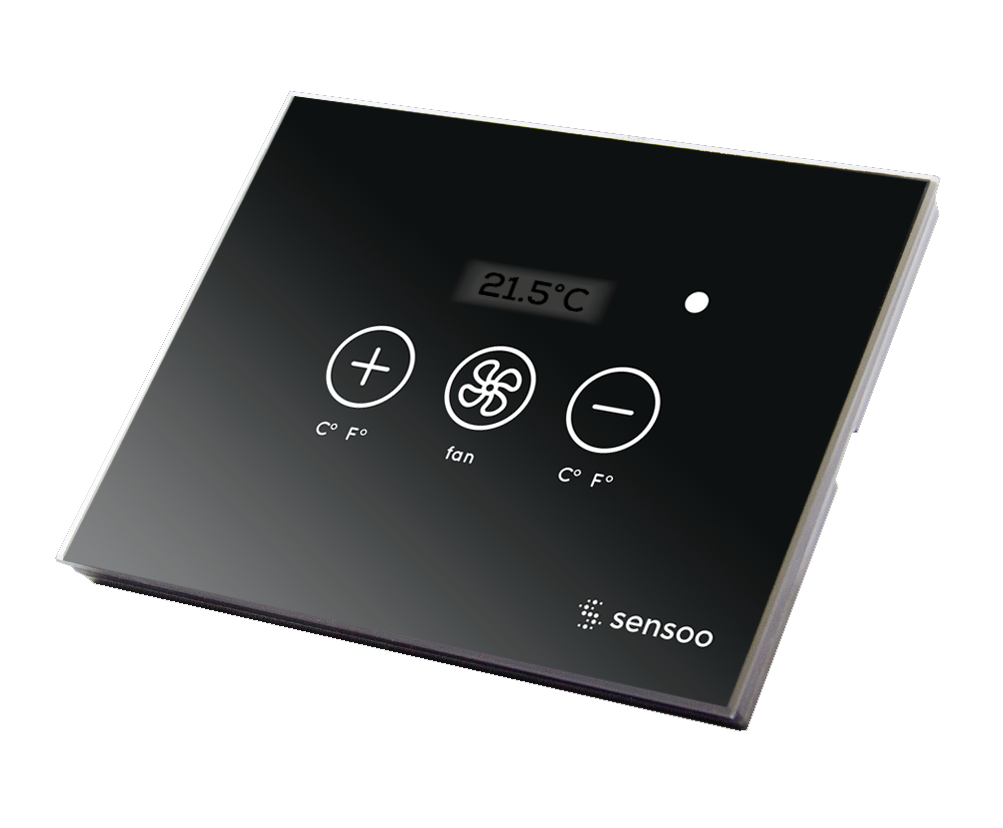 Air ConditionThe Thermostat is a wall mounted device with a standard 3 module-wide front panel, having a glass finishing. The image presents the standard front panel with all its graphical elements. The thermostat has 6 thermal regimes each with its own parameter set. Each regime can be configured to operate according to a particular room status. For each regime it is possible to set the LOW and HIGH temperature limit, the SET temperature what can either be a VALUE or an INTERVAL, the LOCKED status of the keyboard, and the MUTE option for the internal beeper.
