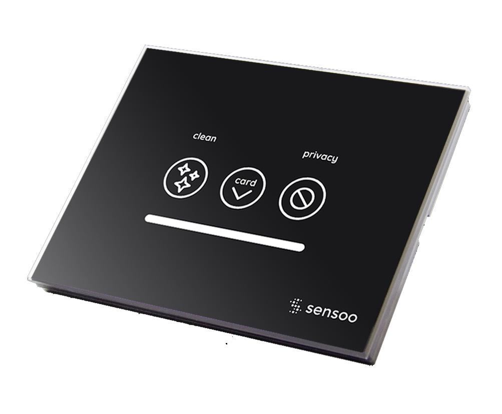 Panel 3 TouchThe Touch switch is a wall-mounted device with a standard 3 module-wide front panel, having glass finishing. The image presents the standard front panel with all its graphical elements. The touch switch has 3 configurable switches that can be assigned to functions as Privacy, Clean My Room, Lighting Control, Master Off and so on